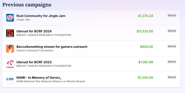 My first campaign was in memory of a long term regular viewer, Germz_. His sister reached out to me after finding my discord & Stream saved on his pc after they found him. In his memory we raised money for NAMI (The National Alliance on Mental Illness)