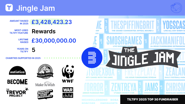 In 2025, Jingle Jam raised £3,428,423 for eight charities spanning mental health, children's welfare, LGBTQ+ support, animal conservation, and conflict relief, including Autistica, Become, CALM, The Grand Appeal, Make-A-Wish, The Trevor Project, War Child, and WWF. Their lifetime total on Tiltify now stands at £30 million, a number that speaks to what happens when a community shows up the same way, year after year, for over a decade.
