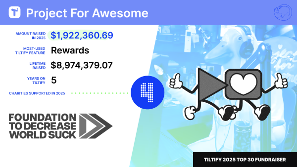 In 2025, $1,922,360.69 was raised on Tiltify during Project for Awesome, bringing the campaign’s lifetime total on the platform to $8,974,379.07 in support of the Foundation to Decrease World Suck. With additional off-platform matches and contributions, Project for Awesome 2025 ultimately generated $3,739,917 for charitable causes. 50% of funds went to core partners Save the Children and Partners in Health, while the remaining 50% was split among 30 charities chosen by the community itself, spanning global health, animal welfare, environmental justice, and human rights.